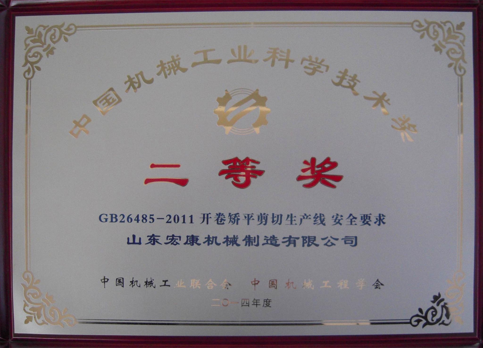 根据中国机械工业科学技术奖励工作办公室《关于表彰2014年度中国机械工业科学技术奖奖励项目的通报》,集团公司主持制定的《GB26485-2011 开卷矫平剪切生产线 安全要求》国家标准获中国机械工业科学技术进步二等奖。