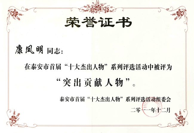 1月6日,由泰安市工商联、市科技局、市商务局、市经济合作局、市电视台共同举办的泰安市首届“十大杰出人物”系列评选活动颁奖典礼在泰安广播电视台隆重举行。公司董事长、总经理康凤明被评为“泰安市突出贡献人物”。副总经理朱洪臣被评为 “泰安十大科技创新人物”称号。泰安市委常委、宣传部部长张志华,泰安市人大副主任杜卓群,泰安市政协副主席、市工商联主席张庆明,出席活动并为获奖的“十大杰出人物”颁奖。