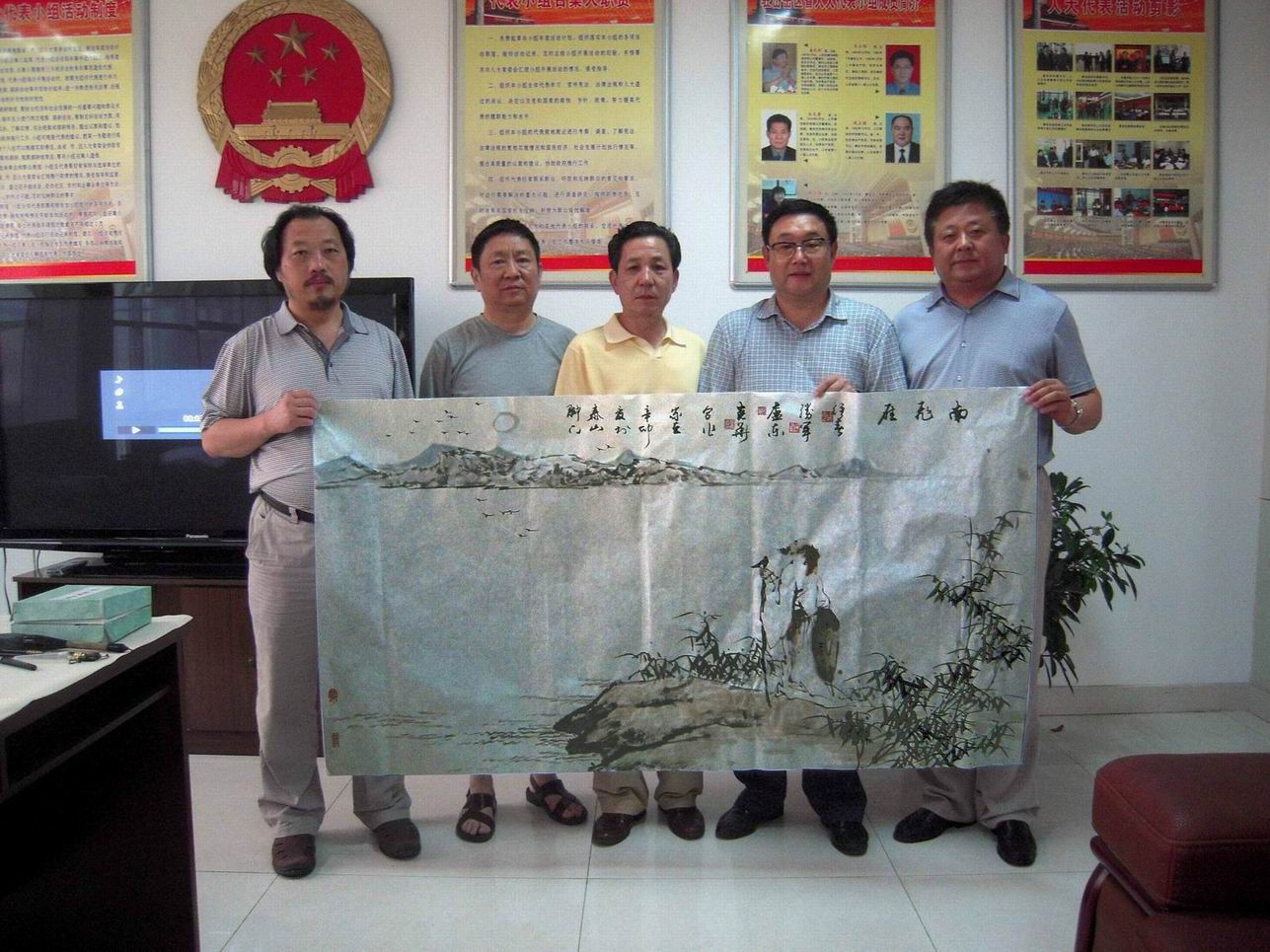 经过一天的即兴创作,4位画家共创作书画作品28 件,作品内容丰富多彩,格调清新高雅、风格各异,展现人间真、善、美。具有较高的艺术水平和观赏价值。书言志,画传情,让人不禁置身于画的意境,在这炎炎夏日,感到阵阵清凉,神清气爽。其中一幅《南飞燕》作品由四位画家合作而成:浪水滔滔,长空中一群大雁歌声长鸣,一位智者仰望天空,越发感人深思。表现了几位艺术家深厚的生活积累和不俗的艺术功底,博得公司领导的一致好评。