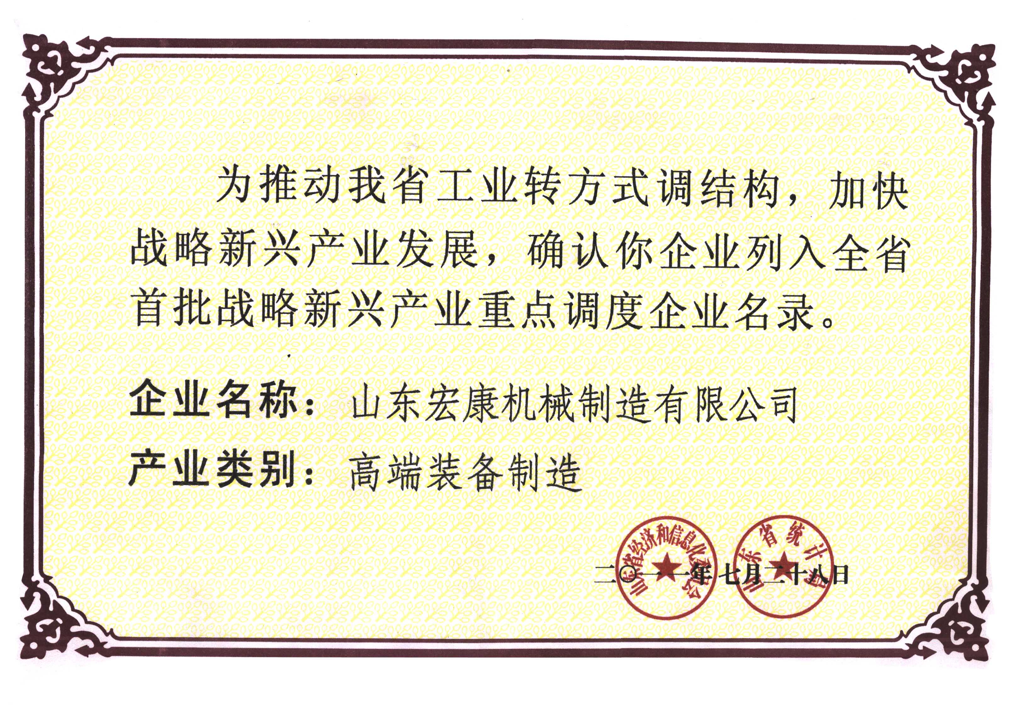 为认真贯彻落实省委、省政府关于“十二五”期间加快发展战略新兴产业的重大决策部署,充分发挥战略新兴产业重点企业的引领和带动作用,推动我省工业转方式、调结构,提高经济运行质量和效益。经公司申报,泰安市经信委和统计局审核推荐,省经信委、省统计局联合审核认定了全省254家首批战略新兴产业重点调度企业,其中高端装备制造企业33家,我公司名列其中。
