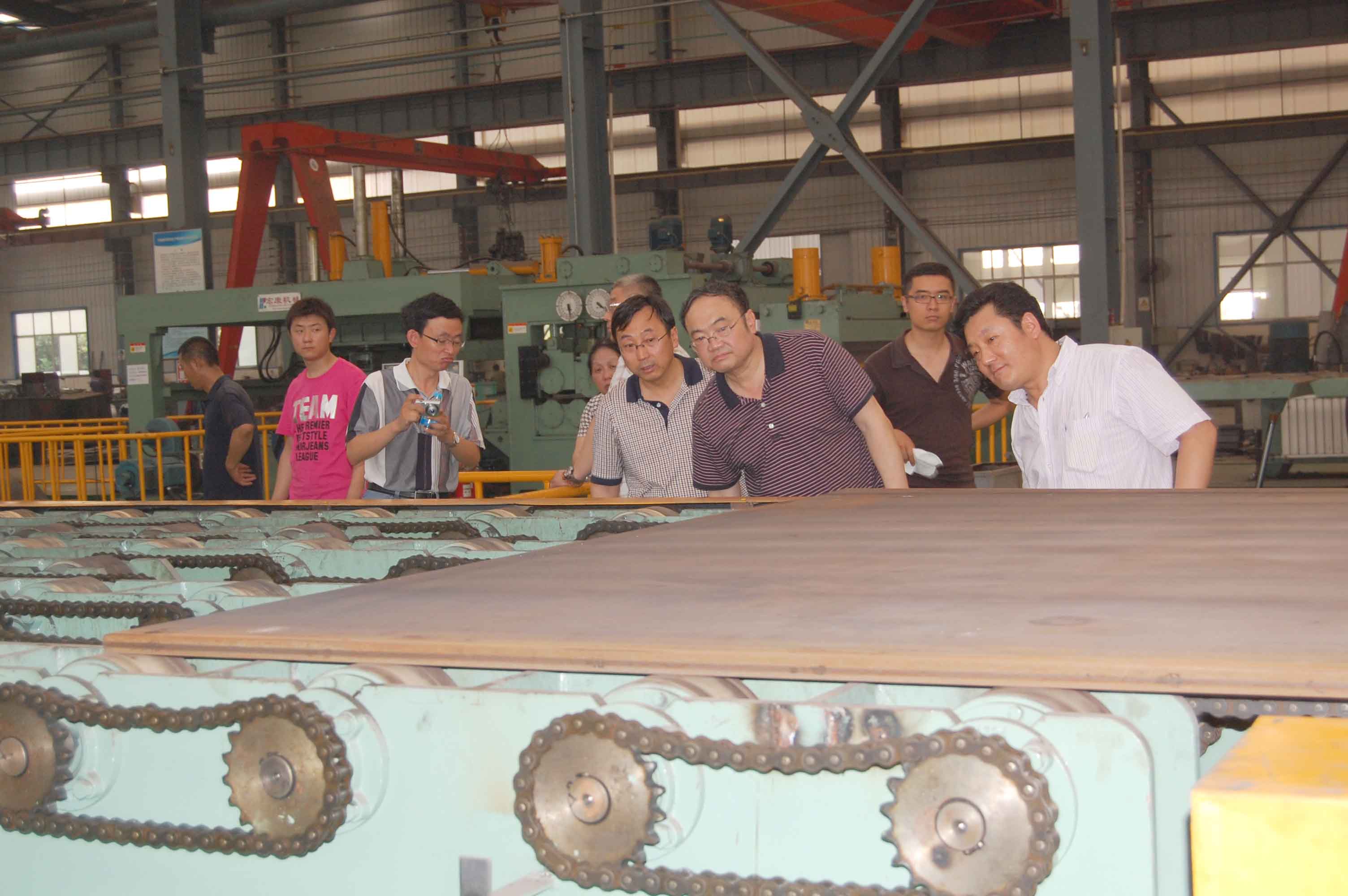 6月29日,首钢京唐钢铁联合公司领导组团来公司考察。图为副总经理朱洪军陪同该公司销售部常务副部长刘宪君在钢铁物流公司考察T44-5~25.4×2200开卷矫平移动剪切生产线。