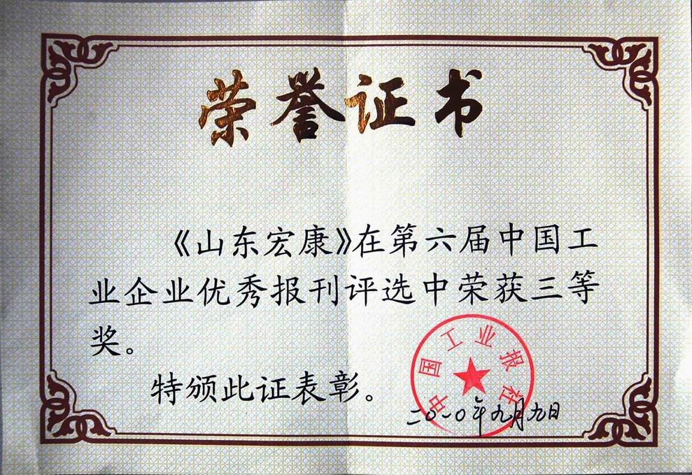《山东宏康》荣获第六届中国工业企业优秀报刊三等奖;吴斌同志策划的《“爱我中华.心系泰山.振兴中华”演讲活动》荣获第六届中国工业企业优秀报刊和好新闻评选策划三等奖。